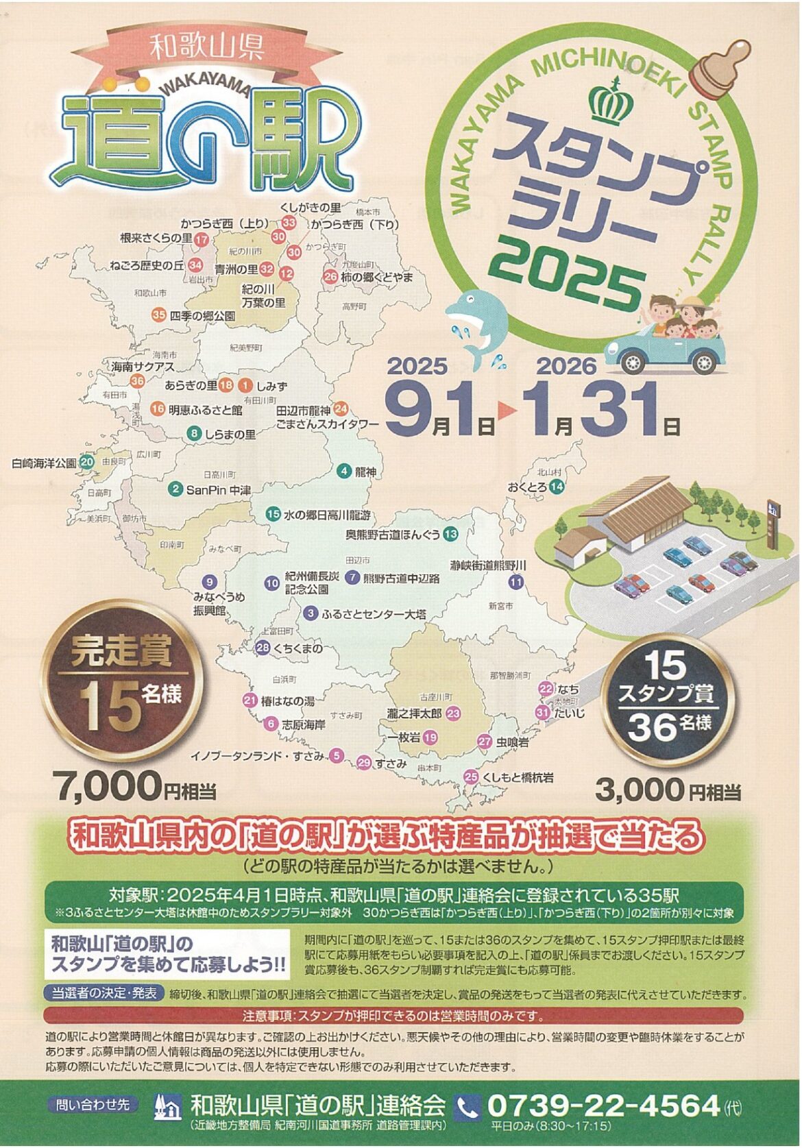 ※和歌山県 道の駅スタンプラリーに関しましては、応募等の事務手続きがあるため、休日中の対応が難しく、平日のみの押印となっています。何卒ご理解、ご協力の程、よろしくお願いいたします。