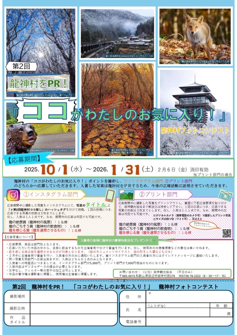 2025年10月1日(水)から、第2回 龍神村をPR!『ココがわたしのお気に入り!』龍神村フォトコンテストが本日から開催!10月に入り、涼しく過ごしやすい季節となってきました。黄色や赤に色づく紅葉や、美しい雪化粧など龍神村のお気に入りポイントを写真を撮影し、フォトコンテストに応募してください!